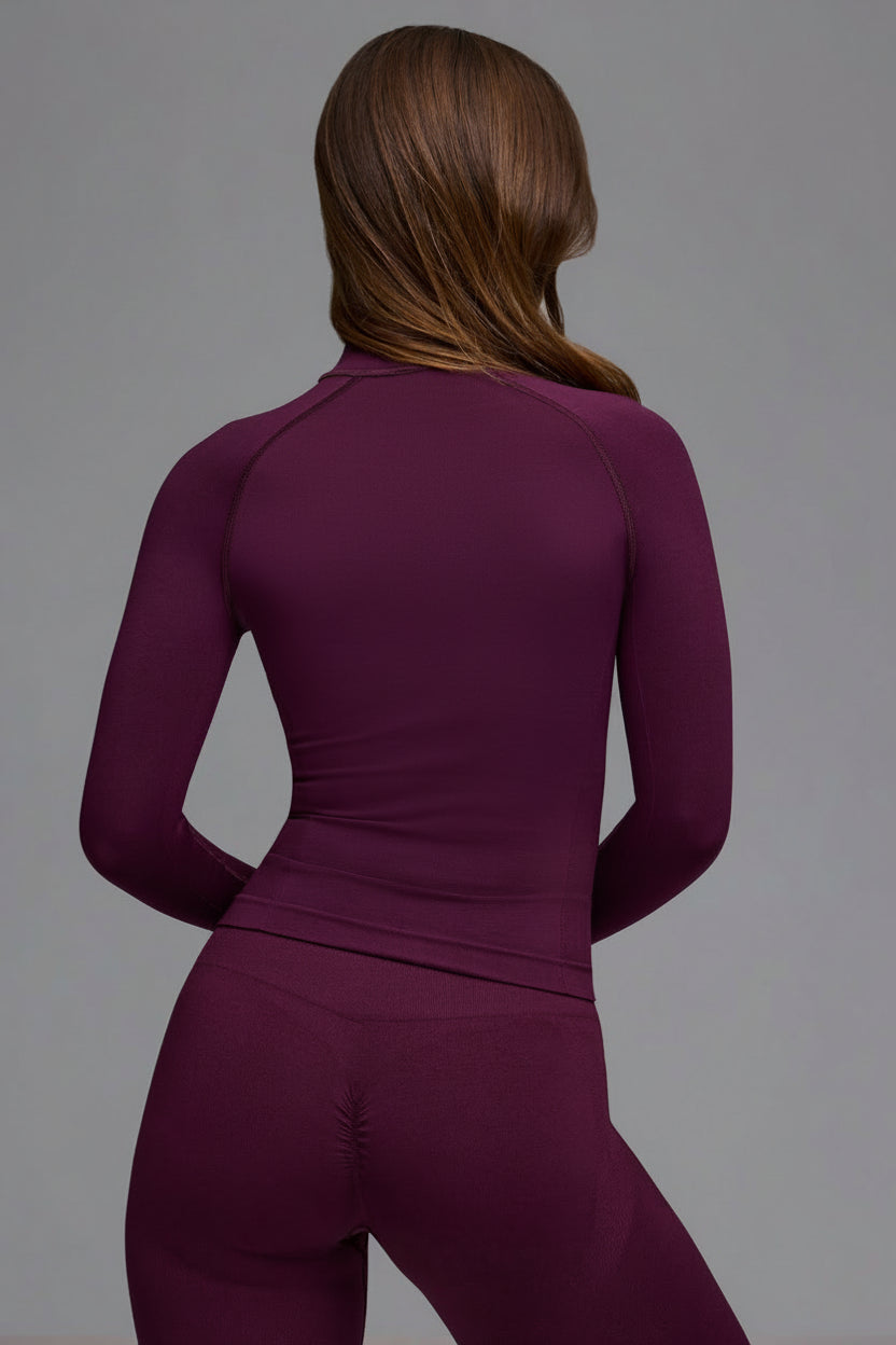 Functional comfort. Made from our breathable, moisture-wicking and lightweight Define Luxe fabric, this jacket is perfect for everyday workouts, outdoor activities and running errands. Designed for a second-skin fit, it features underbust contouring and compressive ribbed panels along each side, creating a sculpted look. It has a high collared neckline for extra protection against the elements and a signature Bo+Tee logo at the back.